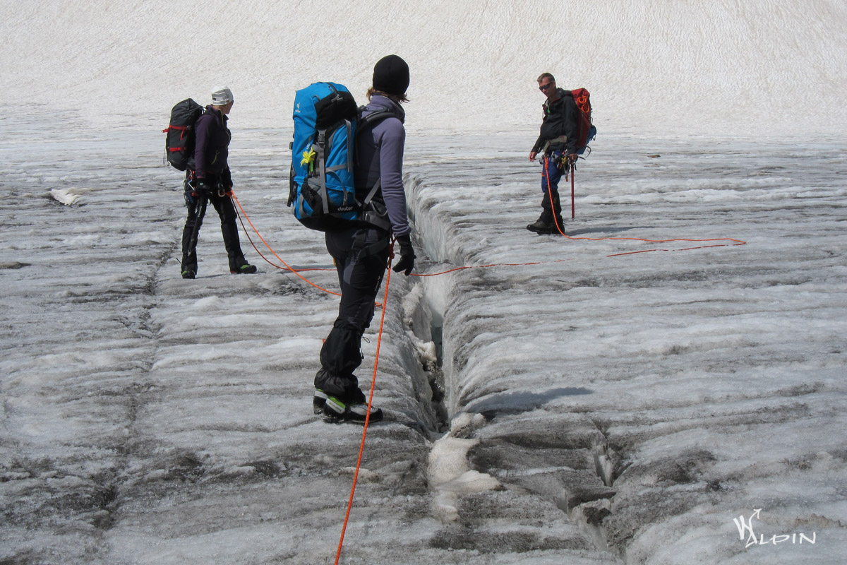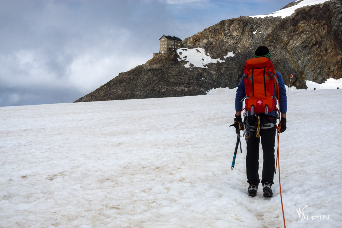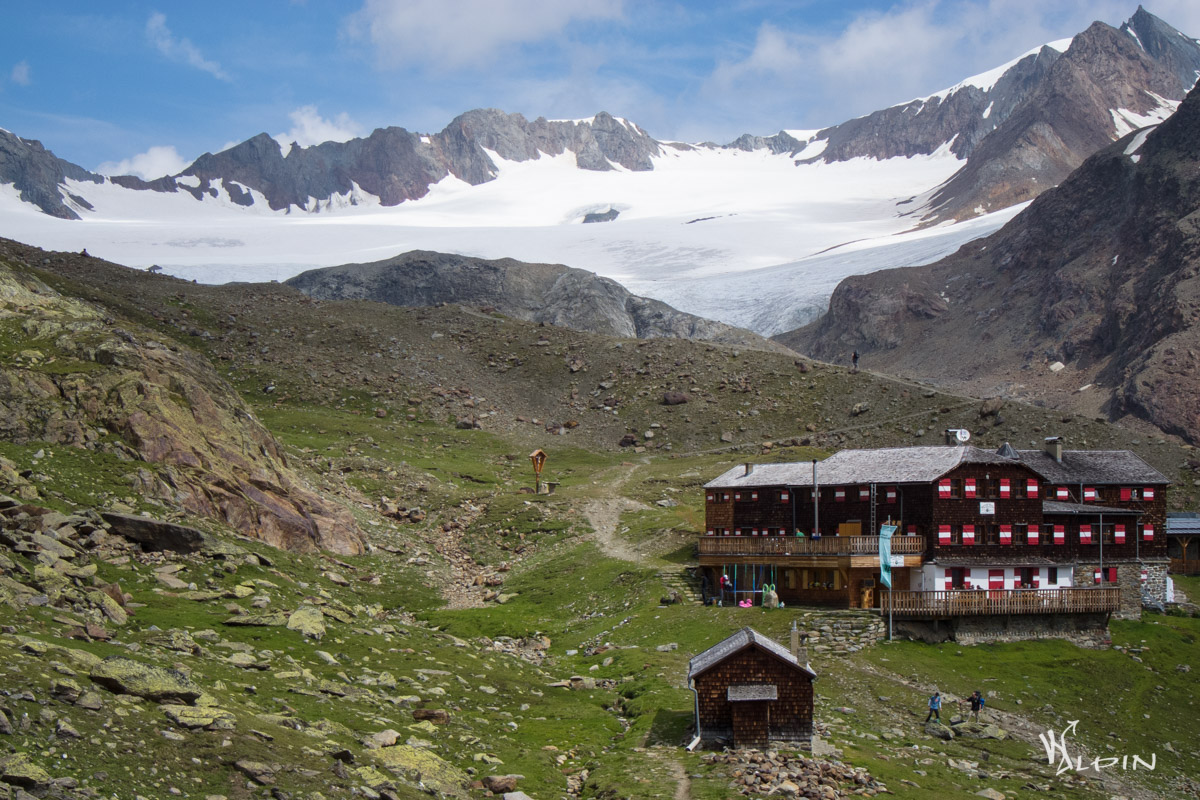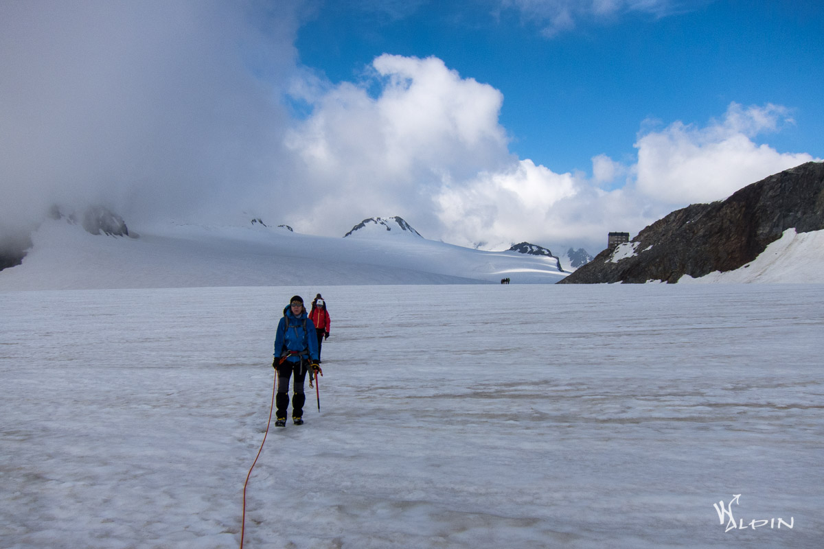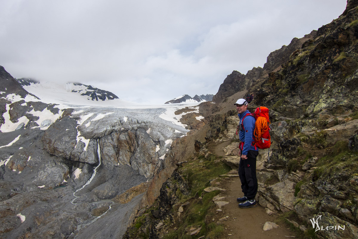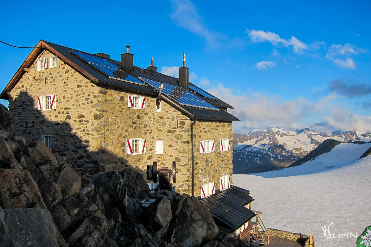 Am nächsten Morgen war es stark bewölkt aber trocken. Für den nicht allzu langen Weg zu unserem nächsten Ziel dem Brandenburger Haus waren das ganz passable Bedingungen. Bald hatten wir den Kesselwandferner erreicht. Obwohl dieser recht spaltenarm ist seilten wir uns an. Die Steigeisen konnten wir allerdings auslassen. Der Gletscher war auch ohne sehr gut begehbar. Und dann konnten wir unser Tagesziel schon sehen. Mitten im Fels thronte das Brandenburger Haus, umgeben von Gletschern, einfach traumhaft.