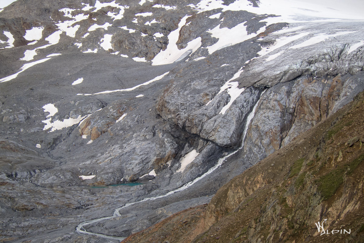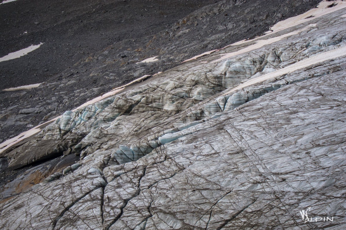 Kurze Zeit später standen wir wieder am Joch und machten uns nach einer kurzen Pause in der warmen Sonne an den Abstieg hinunter zum aperen Guslarferner. Gegen Mittag erreichten wir bereits die Vernagthütte, bezogen unser Zimmer, stärkten uns mit einer Suppe und unternahmen noch einen Spaziergang Richtung Gepatschjoch. Das hätten wir besser sein lassen. Waren wir bisher trocken geblieben erwischte uns auf dem Rückweg, na? Richtig, Regen. Egal, die Vernagthütte hat ja auch einen Trockenraum.