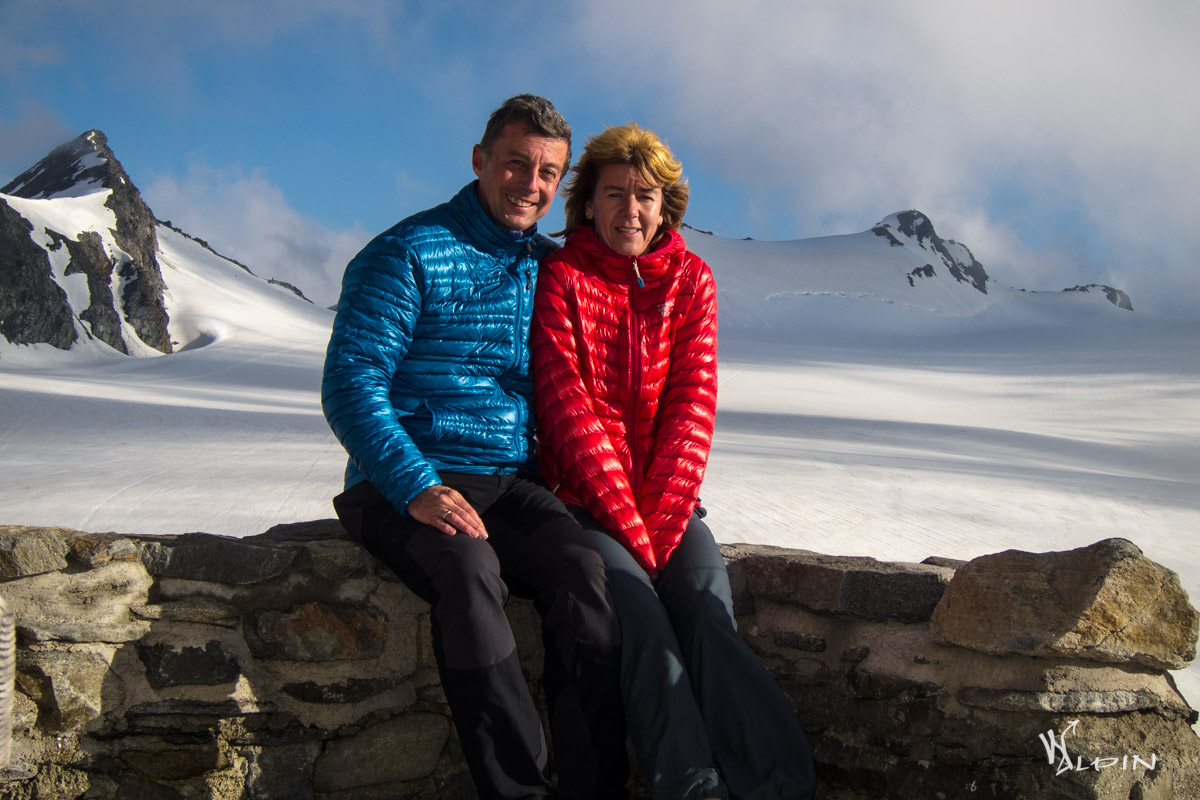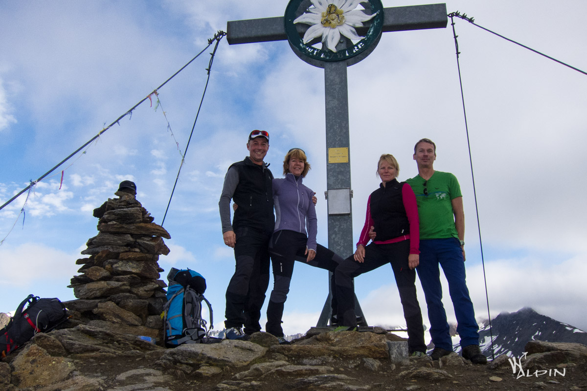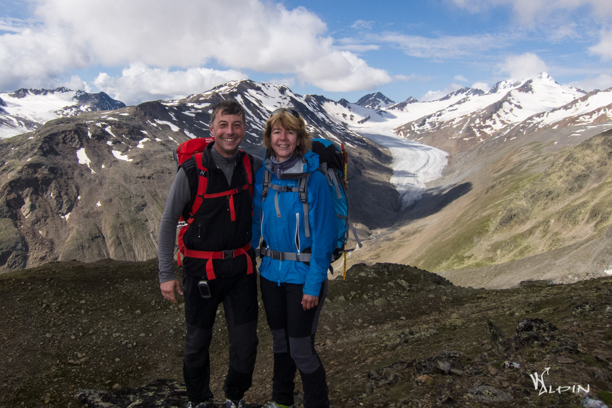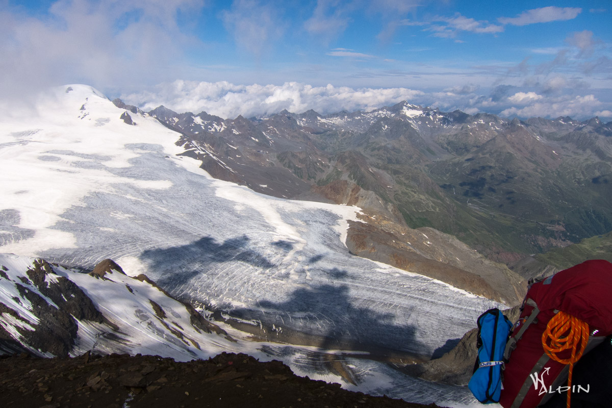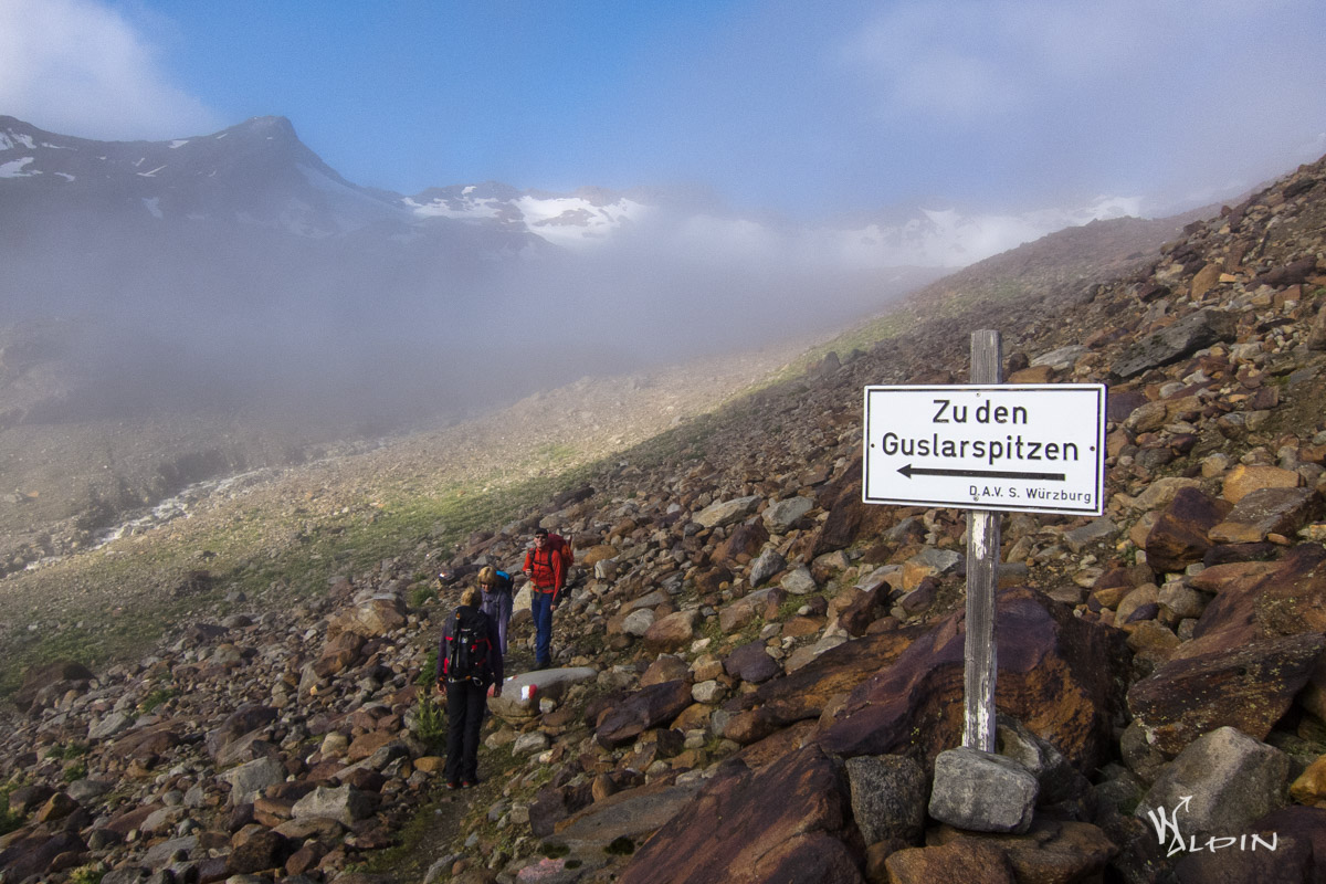 Gesagt, getan. Am nächsten Morgen erwartete uns nach dem Frühstück gutes Wetter. Die letzten vom Tal aufsteigenden Nebelschwaden waren bald verschwunden. Stattdessen zeigte sich blauer Himmel und die Sonne lachte. Der Weg von der Vernagthütte führt zur Mittleren Guslarspitze. Kurz davor führt allerdings ein Abzweig nach rechts Richtung Hintere Guslarspitze. Unsere Frauen gingen den gut sichtbaren Weg weiter, wir wollten unbedingt den Abstecher machen. Schnell erreichten wir die hintere Spitze, bewunderten den Ausblick und machten uns dann daran den Frauen zu folgen.