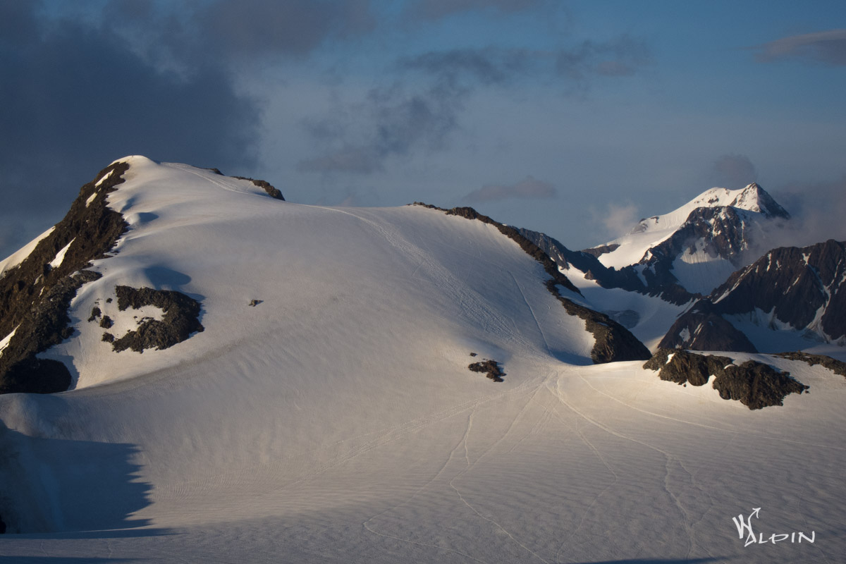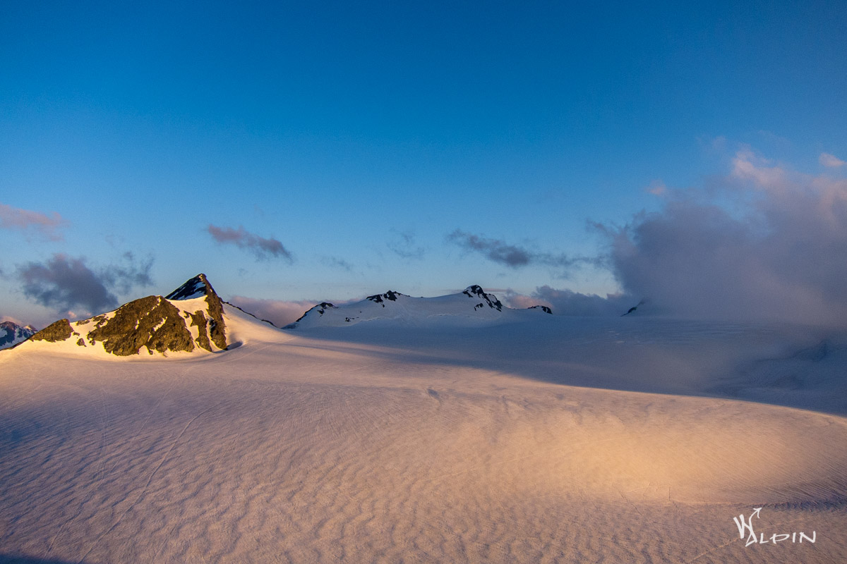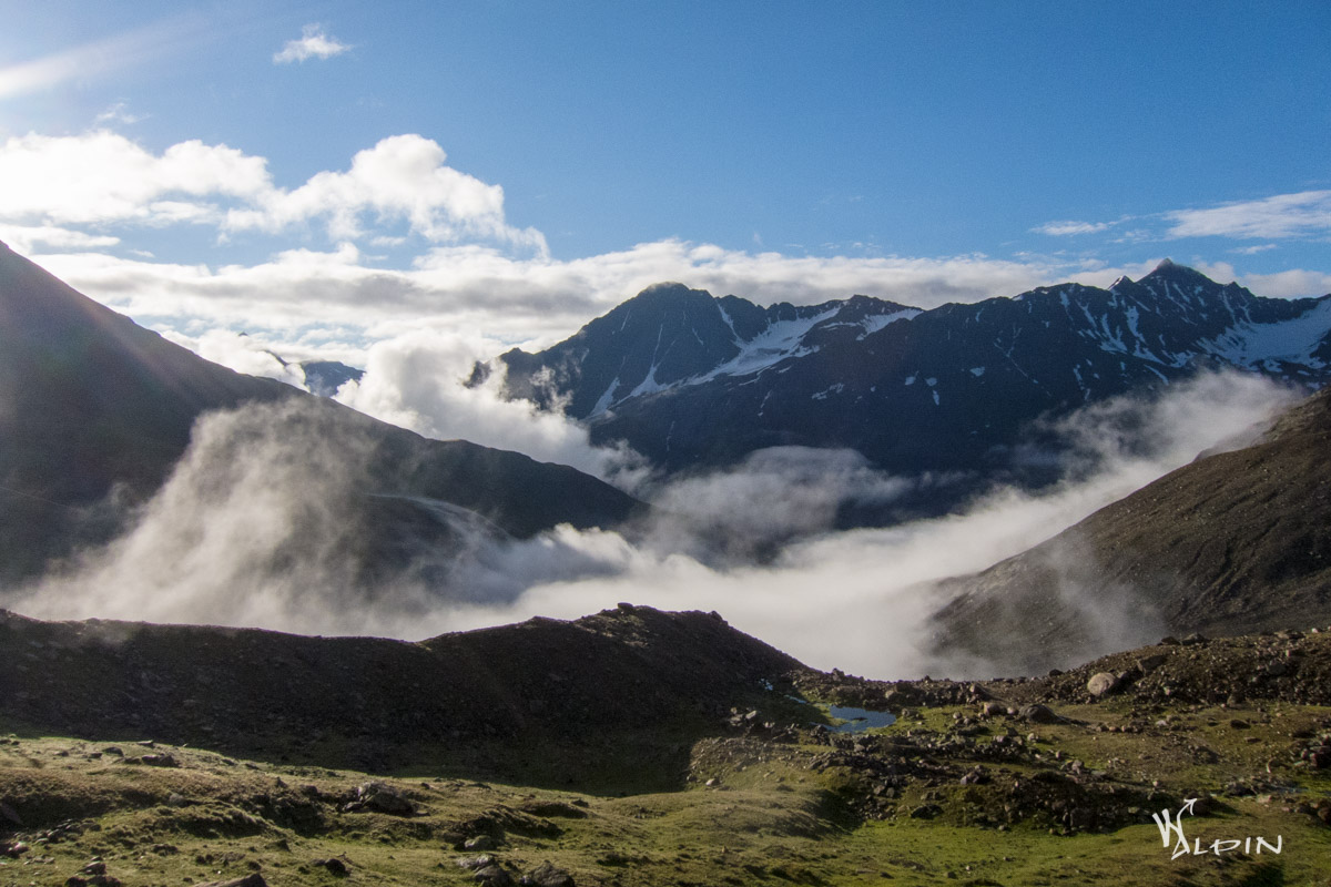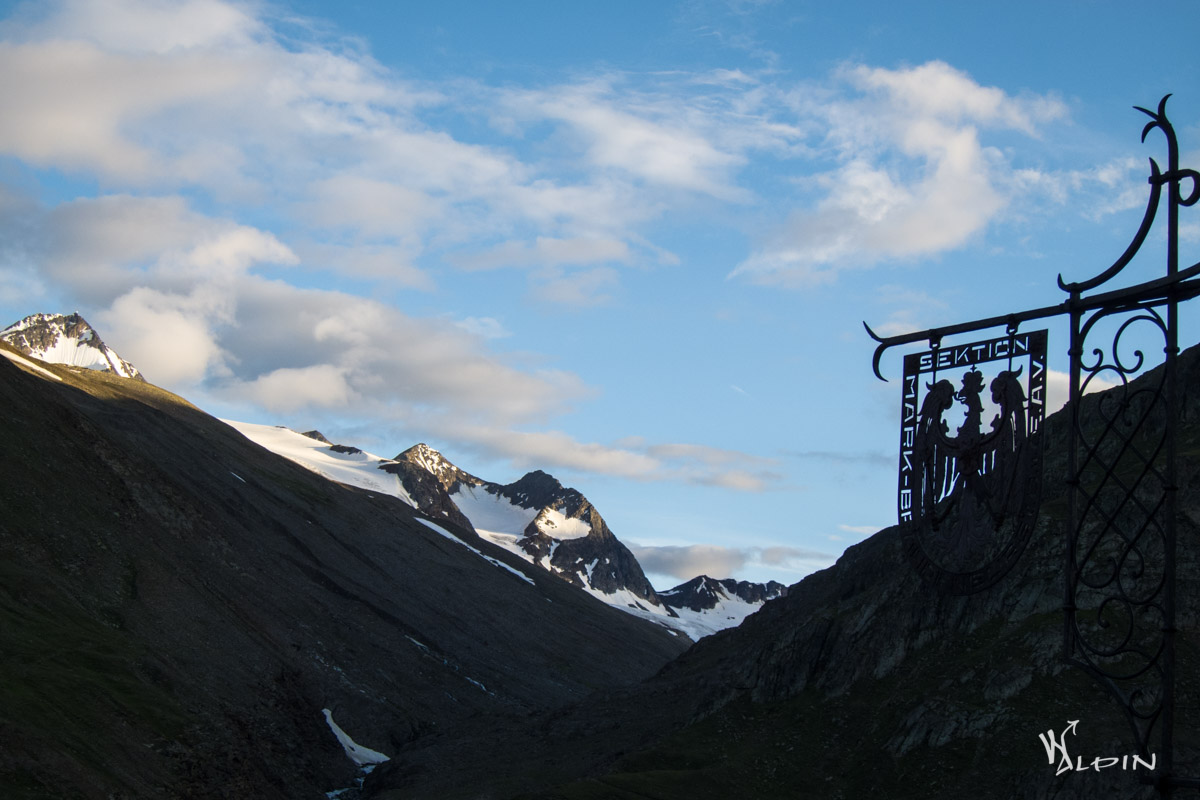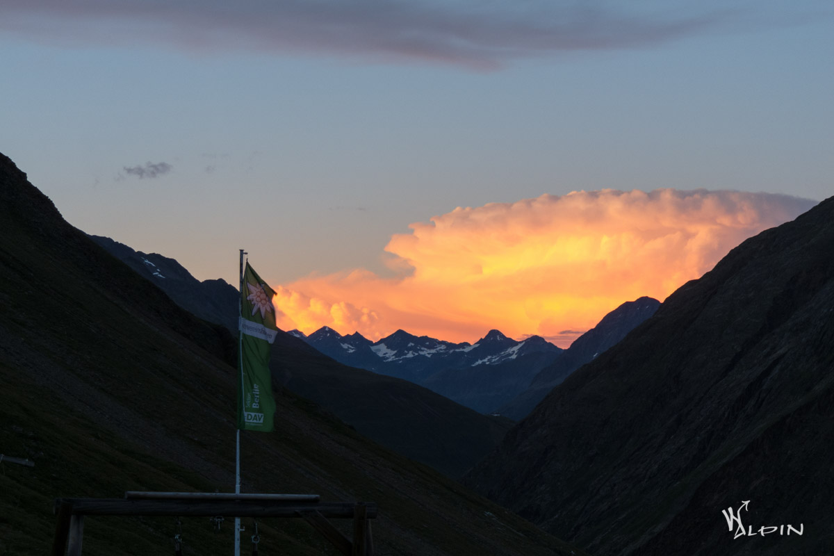 Nach dem Abendessen klarte es aber auf, und wir beschlossen nochmals auf die Dahmannspitze zu steigen in der Hoffnung auf bessere Sicht. Und wir wurden nicht enttäuscht. Nicht nur unser nächstes Ziel der Fluchtkogel lag plötzlich frei. Auch die Wildspitze zeigte sich dahinter. Wir wurden mit einem wunderschönen Bergpanorama belohnt.