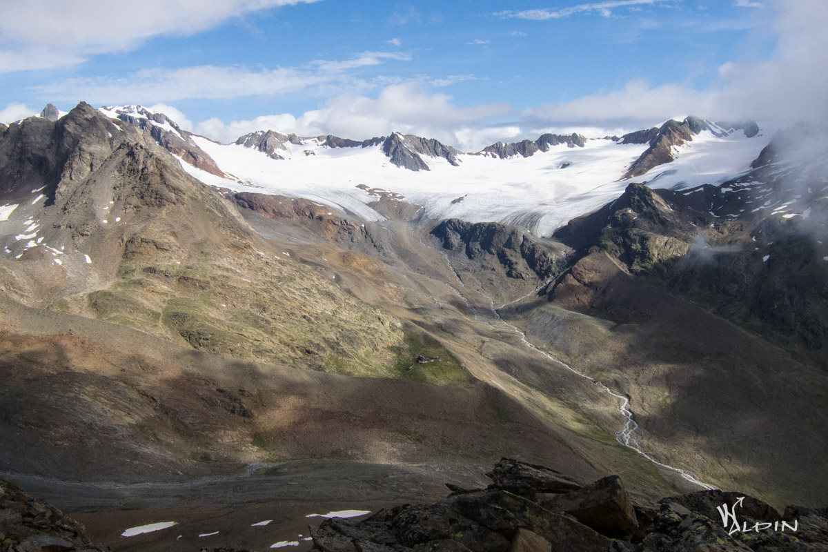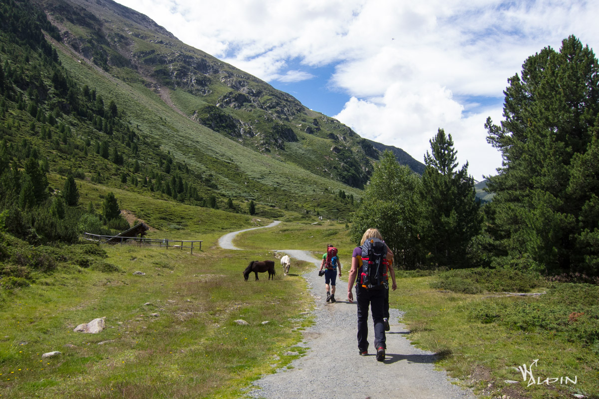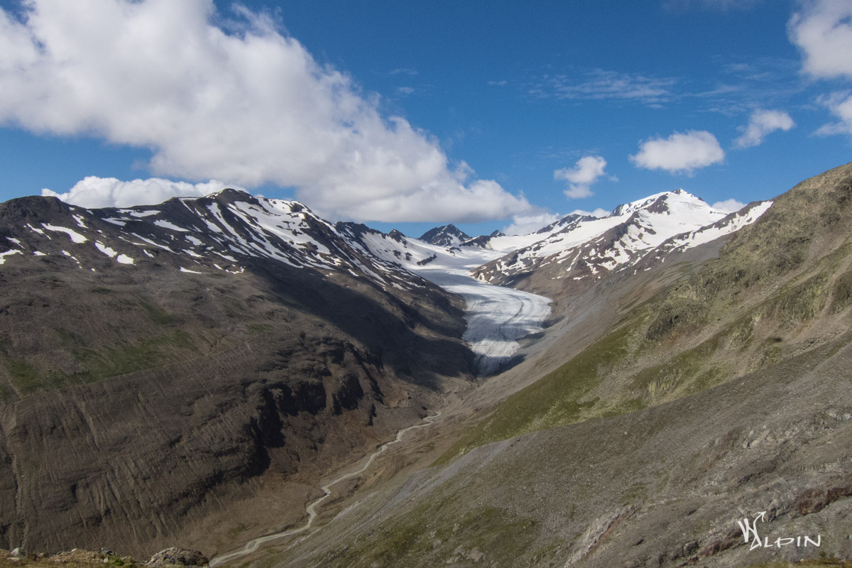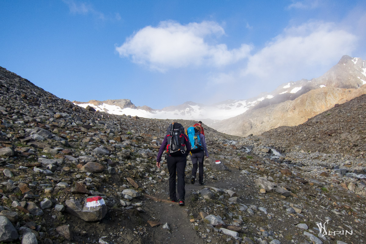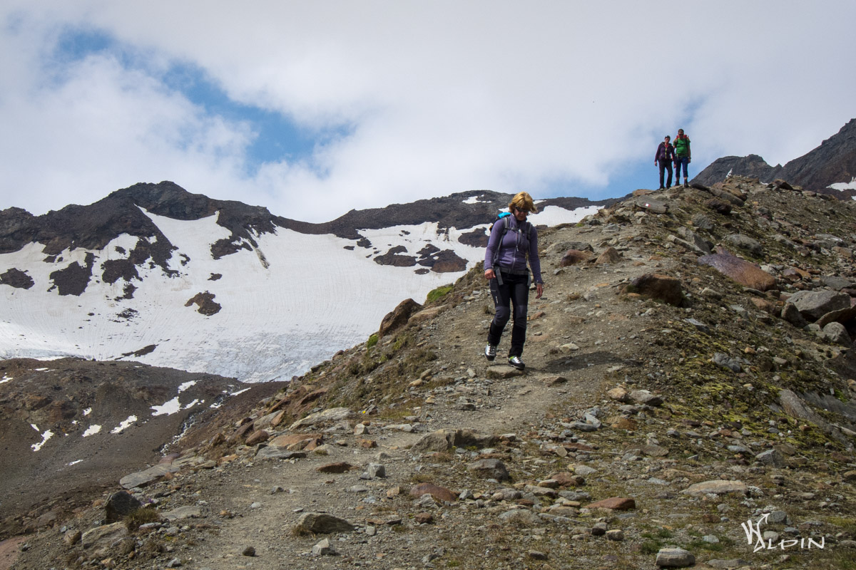Wieder zurück ging es nach dem obligatorischen Gipfelfoto abwärts Richtung Hochjoch Hospiz. Das war bald erreicht. Wir machten dort aber nur eine kurze Pause und wanderten gleich weiter über den Weg vom ersten Tag zurück nach Vent. Im Gegensatz zu den Vortagen blieb der Nachmittag trocken und sonnig.