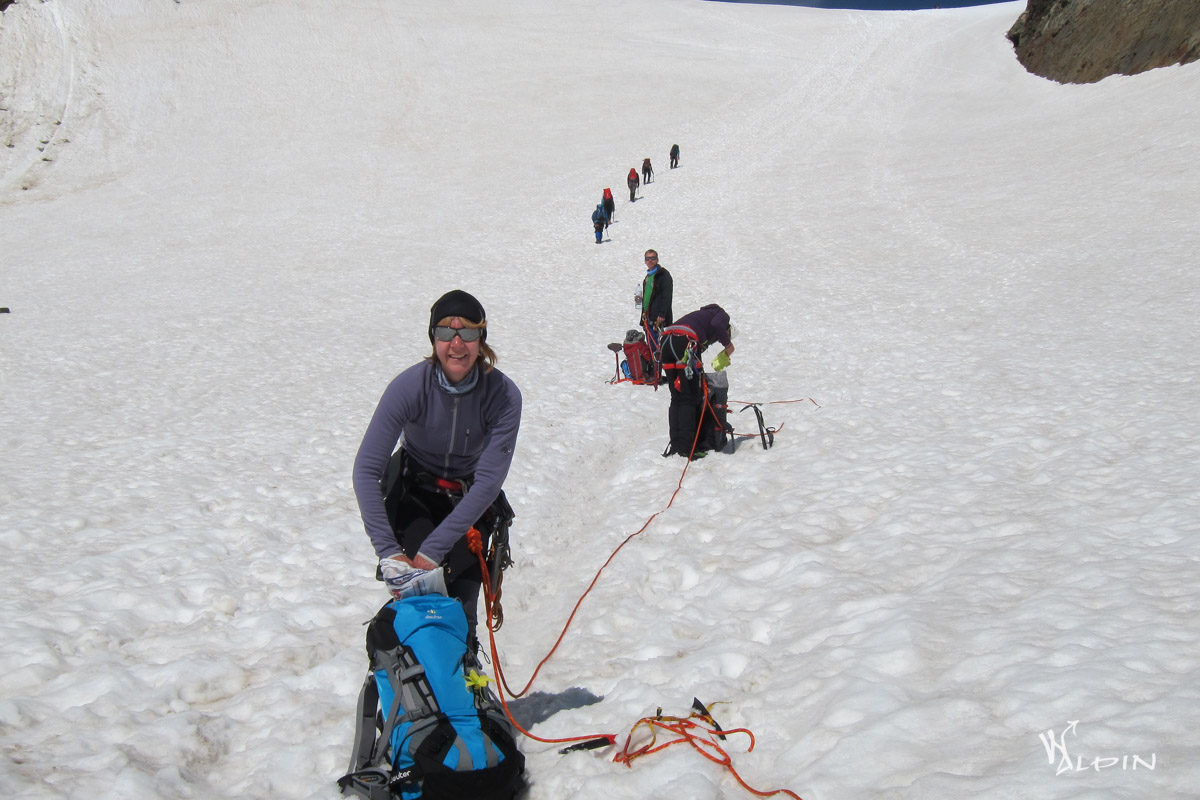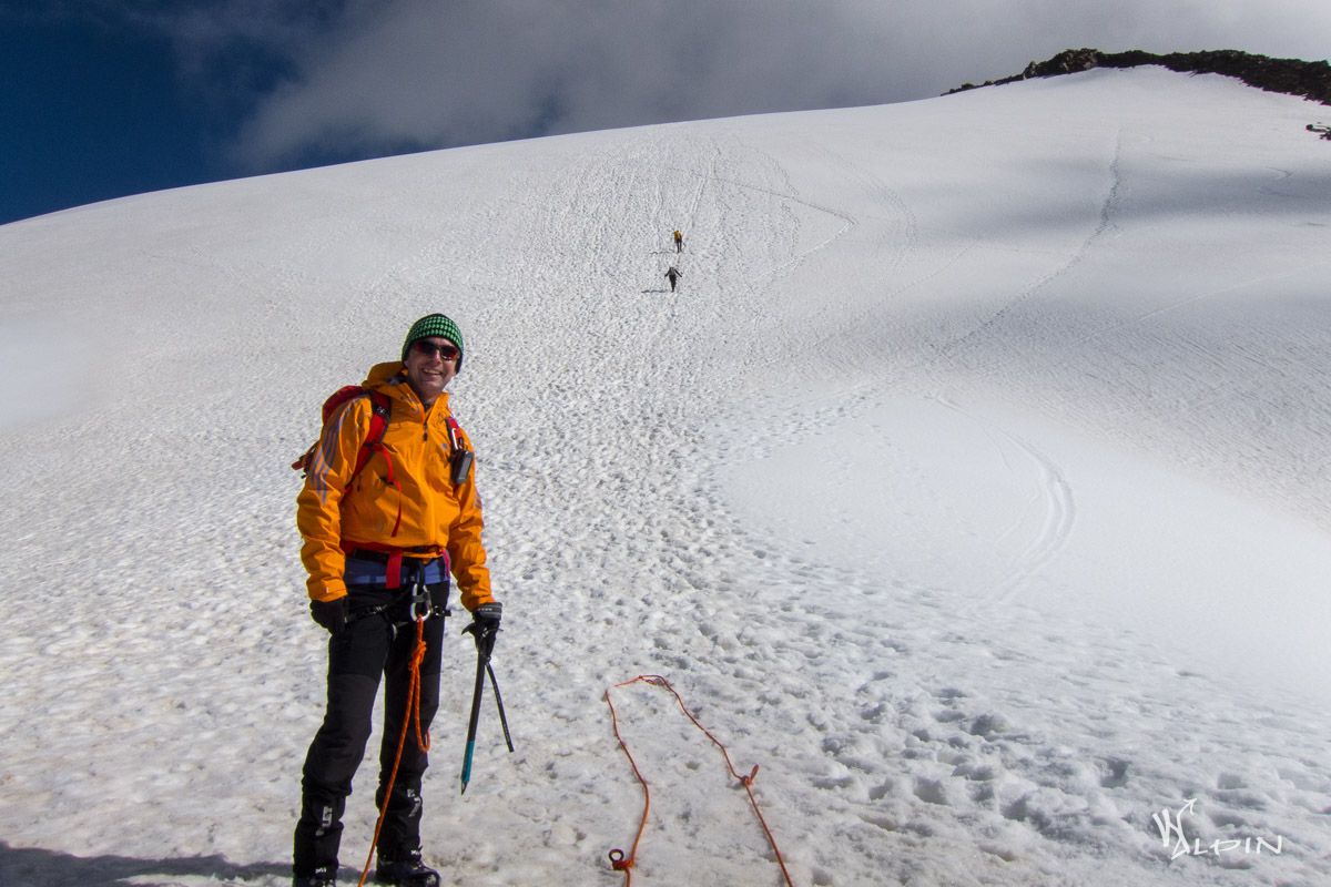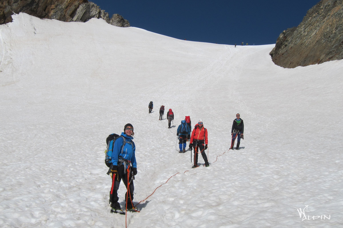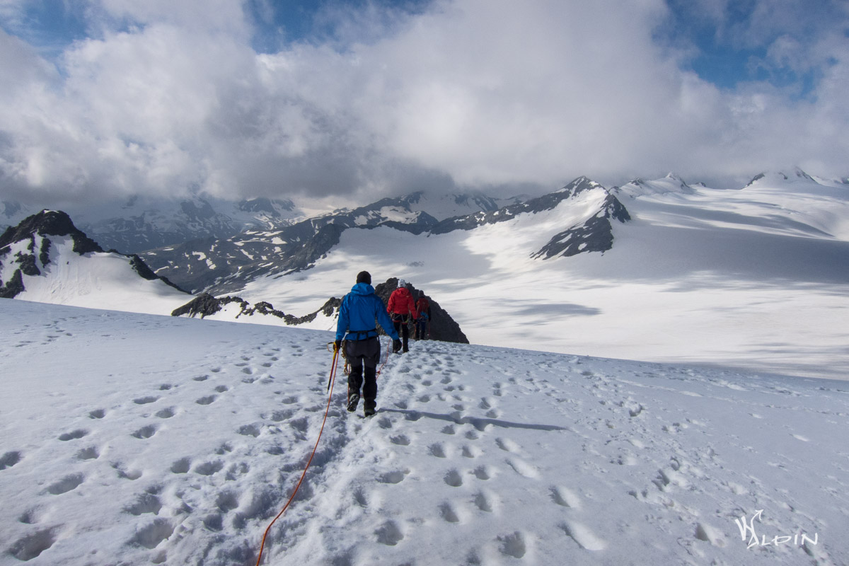 Nach einer – trotz der Höhe – guten Nacht machten wir uns nach dem Frühstück auf Richtung Fluchtkogel. Wir gingen wieder am Seil, Dank der guten Bedingungen ohne Steigeisen, und querten den Kesselwandferner bis zum Guslarjoch. Ein Teil der Gruppe lies dort die Rucksäcke zurück. Nun lag nur noch der etwas steilere Gipfelanstieg vor uns. Die Bedingungen waren ideal, wir kamen schnell vorwärts und hatten bald den höchsten Punkt unserer Tour erreicht. Auch das Wetter zeigte sich von seiner besseren Seite, die Sonne schien.
