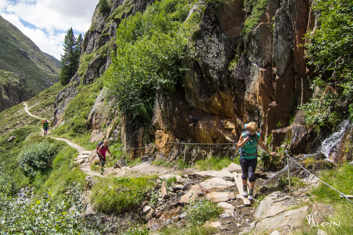 Unsere erste Etappe führte von Vent bis zu den Rofenhöfen. Kurz bevor wir diese erreichten ging es noch über eine Hängebrücke. Der weitere sehr abwechslungsreiche Weg verlief immer entlang der Rofenache. Gut beschildert erreichten wir unser Tagesziel, das gemütliche und auch recht volle Hochjoch Hospiz. Konnten wir noch bei sonnigem Wetter loslaufen erwischte uns eine halbe Stunde vor Ankunft ein ordentliches Gewitter. Ein gutes Abendessen, das leckere Frühstück und der Trockenraum konnte es wieder richten. Und am späten Abend var vom Gewitter auch nichts mehr zu sehen.