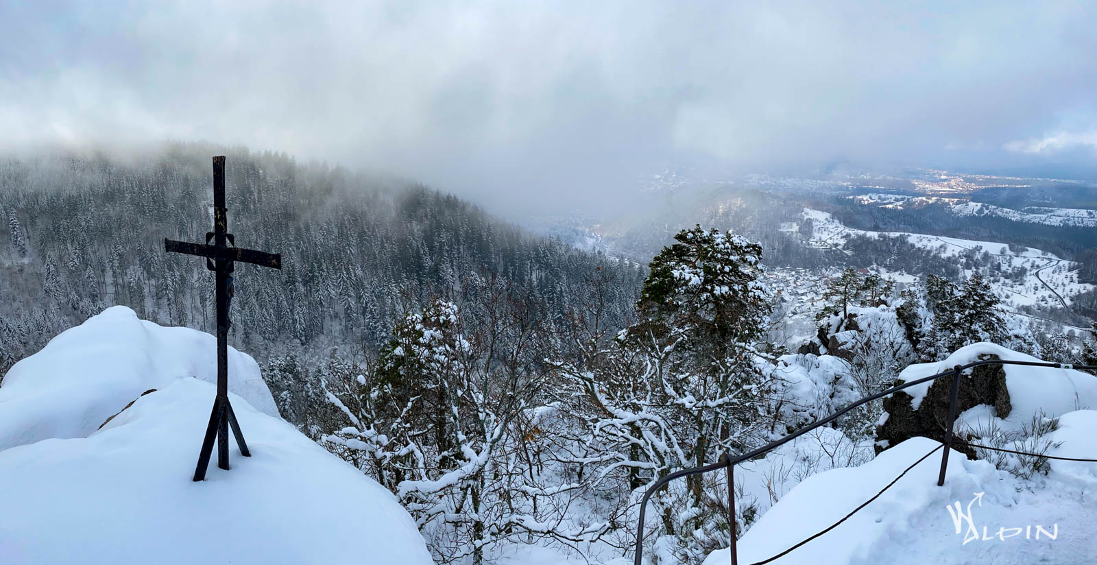 Der Gipfelbereich des Lautenfelsen ist mit einem Geländer umgeben. Und es gibt sogar ein kleines eisernes Gipfelkreuz und eine Bank zum Ausruhen und Genießen. Letztere war aber bereits belegt. So hielten wir uns auch nicht allzugange oben auf und gingen bald weiter. Trotzdem genossen wir hier kurz die tolle Aussicht auf das Murgtal mit Gaggenau.